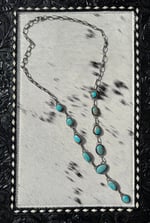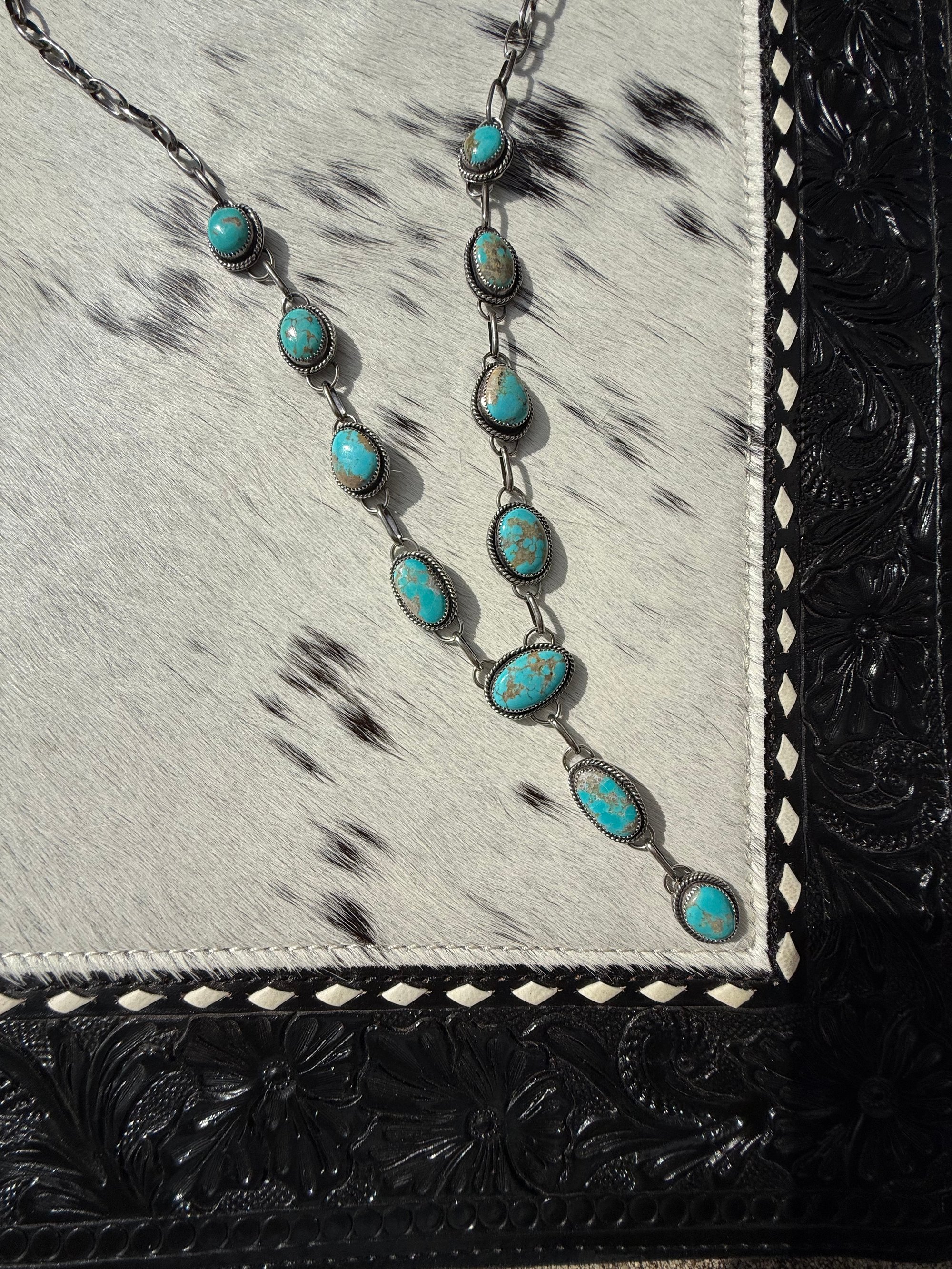 This one-of-a-kind lariat necklace features genuine Royston Turquoise, each stone hand-selected for its vibrant blues, warm golden matrix, and unmistakable Southwest character. Every turquoise piece is bezel-set in sterling silver and linked together to create a flowing, elegant drop that draws the eye.